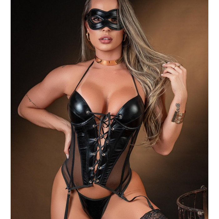 Composição:Tule 100% poliamida, Vinil 100% Poliester, Bojo e mascara 60%Poliuretano 40%Poliester, calcinha Forro 100% Algodão