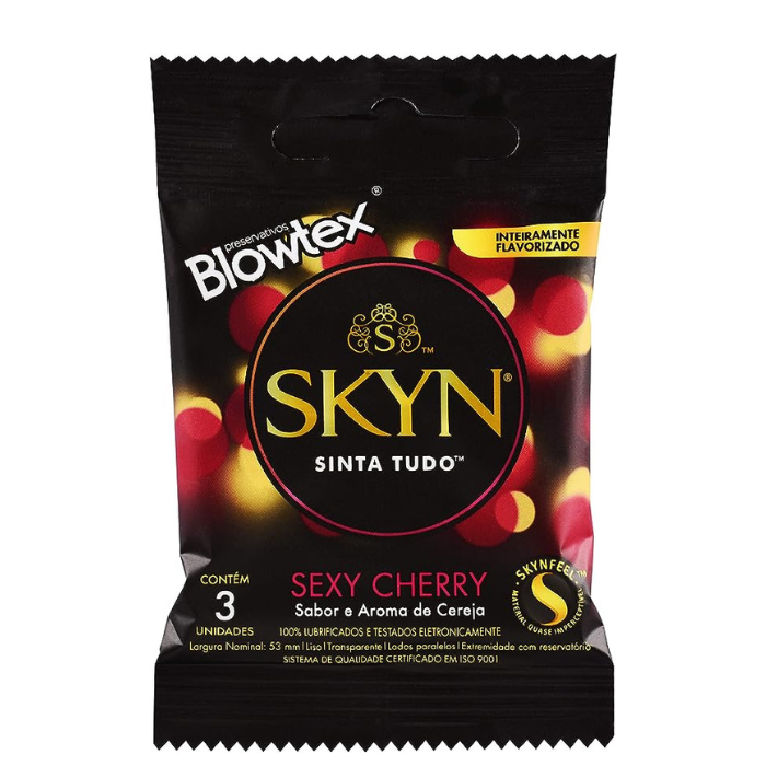 Preservativo que possui sabor e aroma sendo inteiramente flavorizado com notas de cereja o que deixa tudo ainda mais delicioso e também é ultrafino e ultramacio para uma penetração de total conforto , linha skyn que não possui látex.
